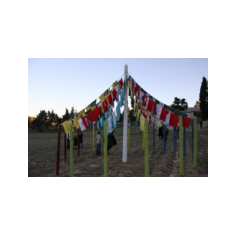 Florence Bouvry crée une yourte "temple" dédiée à l'écoute des mémoires languedociennes" sur le principe du kiosque à musique, autrefois lieu de rencontre, d'échanges et de vie. Faisant référence aux traditions tibétaines, les drapeaux aux couleurs des quatre éléments (eau, air, terre, feu) sont imprimés de mots et d'images qui remémorent les mémoires languedociennes. Le souffle de l'air leur insuffle la vie. Les mémoires ainsi ré-